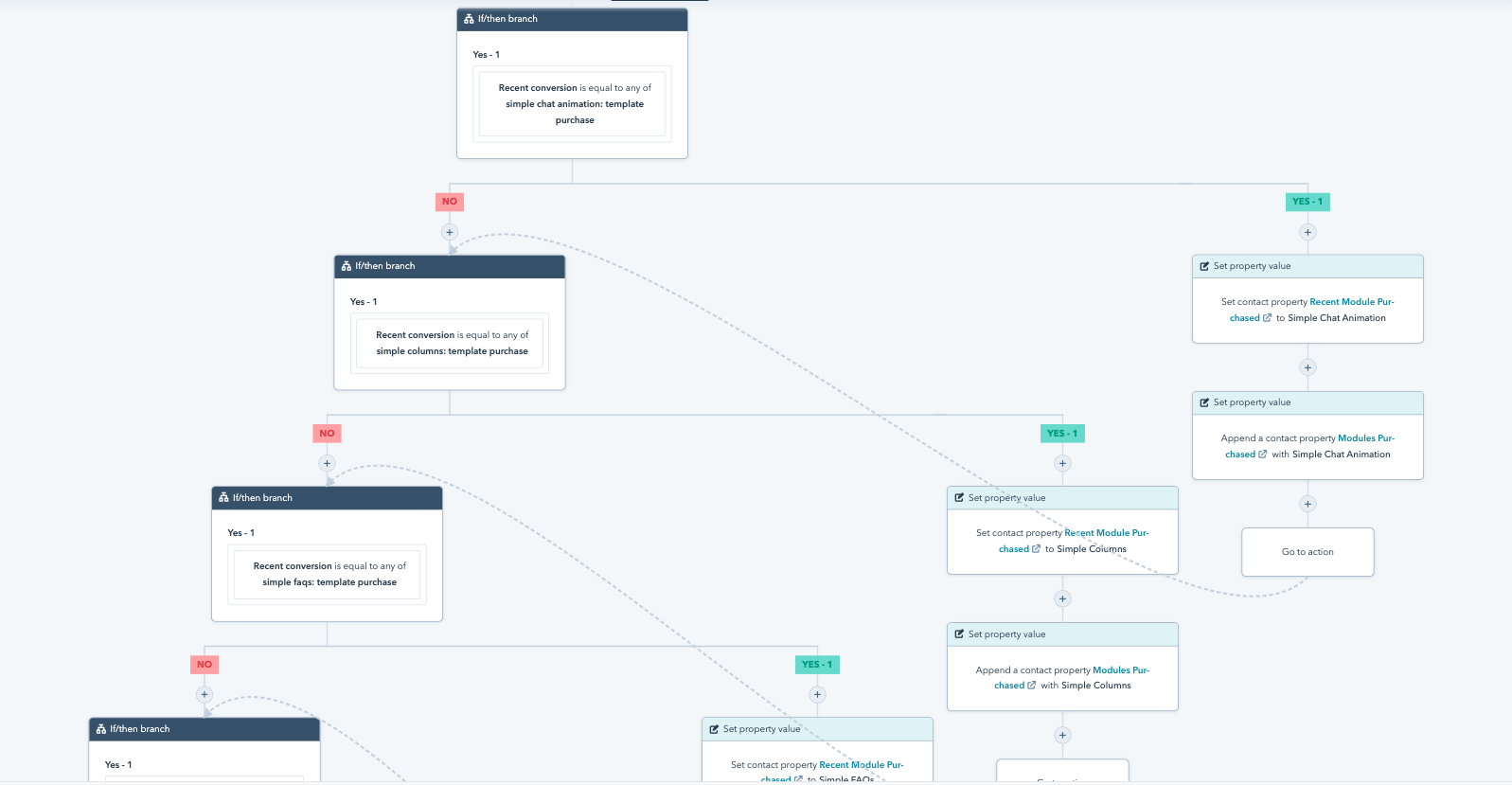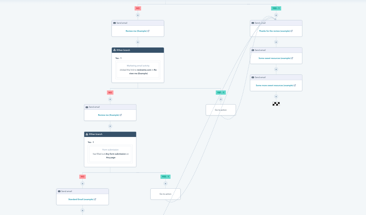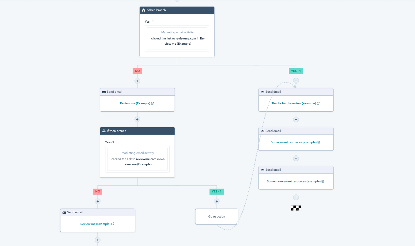 With HubSpot’s new “go to other action”, you can build out your resource branch one time, and use if/then branches to send contacts to it from anywhere in the workflow. This will keep your workflow clean and eliminate the need for repetitive branches and repetitive headaches.